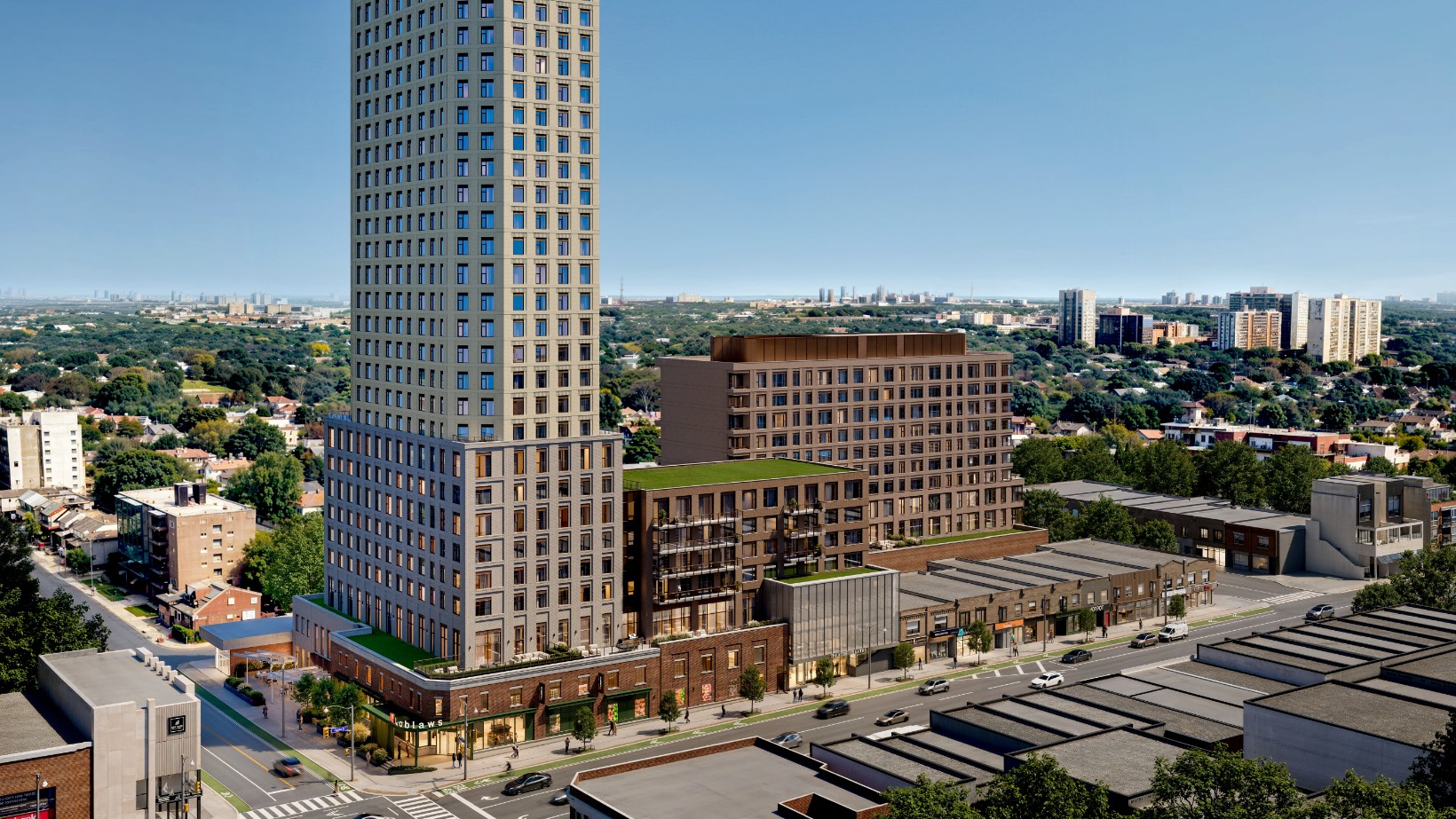 The 985 Woodbine proposal will deliver a revitalized grocery store and two new residential buildings of 10 and 35 storeys, directly adjacent to Woodbine TTC Station. With 646 new homes, including 14 rental replacement units, it supports the area’s growing need for more diverse housing options.